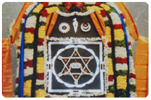 Sri Saneeswara in the sanctum sanctorum graces in a 6.5 feet tall Shivalinga form placed on a peeta of 2.5 feet width.  As in Shivalinga, Moon and Sun have their places on the head.  His crow vehicle is in the middle.  The six faced (Shatkona) yantra with Namashivaya, basic mantras as Beejakshara and Mahalakshmi mantras are inscribed in the Linga.